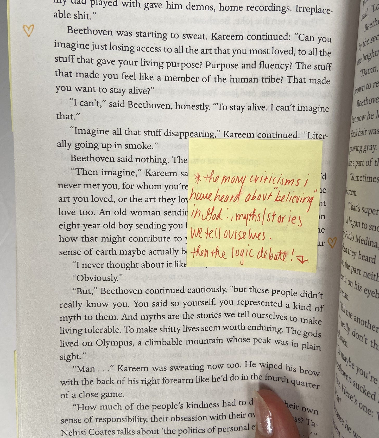 Having now finished it, I can say its summaries don’t quite capture how special of a book this is. It’s written and structured so beautifully and creatively, my copy is filled with little hearts, asteriks, post-its, and exclamation points next to concepts I thought were explored brilliantly and curiously, sentences I found delicious, and scenes that made me pause in resonance or awe.